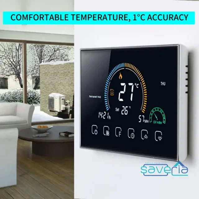 این دستگاه به یک نمایشگر لمسی ۴٫۸ اینچی مجهز است که با طراحی کاربرپسند خود، کنترل دما را بسیار ساده و لذت بخش میسازد. قابلیت اتصال به دستیارهای صوتی مانند Alexa و Google Assistant نیز از دیگر امکانات برجسته این محصول به شمار میرود؛ به طوری که کاربران میتوانند تنها با گفتن یک فرمان صوتی، دمای محیط را مطابق میل خود تنظیم کنند. چنین امکاناتی تجربه ای هوشمند و راحت از زندگی روزمره فراهم میآورند. برای نمونه، در صورتی که هنگام بازگشت به خانه فراموش کردهاید دما را تنظیم کنید، کافیست از طریق یکی از دستیارهای صوتی، وضعیت دما را به حالت دلخواه تغییر دهید. پشتیبانی از ارتباط Wi-Fi و قابلیت کنترل از راه دور، این امکان را فراهم میکند که کاربر حتی زمانی که در خانه حضور ندارد نیز بتواند سیستم گرمایش یا سرمایش محیط هایی مانند منزل، محل کار یا فضاهای تجاری را به آسانی مدیریت کند.