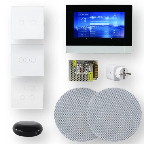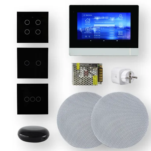 تاچ پنل ۷ اینچی هوشمند قلب اصلی این پکیج به شمار میآید و نقش کنترل مرکزی خانه و مانیتور آیفون تصویری را همزمان ایفا میکند. از طریق این نمایشگر لمسی میتوانید تمام کلیدهای هوشمند نصب شده در اتاقها را کنترل کرده، سناریوهایی مانند «خواب»، «مهمانی» یا «خروج از منزل» را تعریف کنید، تماس آیفون را پاسخ دهید و حتی درب را باز کنید. به این ترتیب، دیگر نیازی به چند دستگاه مختلف برای مدیریت قسمت های خانه نیست و همه چیز با لمس چند گزینه روی صفحه انجام میشود.